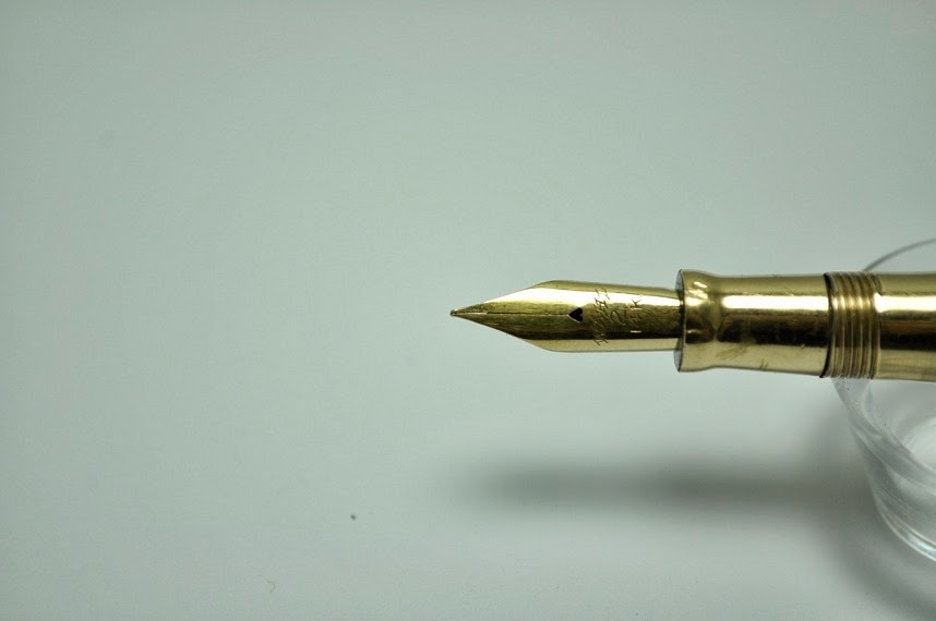 This small gold filled ringtop made by Wahl Eversharp has some trim wear, and the cap does not screw on all the way. It catches just briefly for about a quarter turn then loosens after that. So it would be best kept at home or on a desk where this would not have much affect. There is a monogram. The pen is all original including the nib which has a nice amount of flex to it. Writes from a Fine to BB+ with nice shading behavior when using a shading ink. The nib writes smoothly and the lever filling system has been recently restored, and should provide a long time of flexing fun for its next owner. Please check pics for a better description. Writing sample is done on .5cm grid 90 gsm Clairefontaine paper. Measurements: 9cm capped, 12.5cm posted, and 8.4cm unposted.